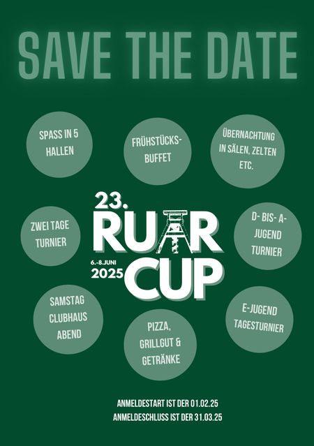 Wir laden alle Jugendmannschaften der Altersklassen E-Jugend bis A-Jugend herzlich ein, dabei zu sein! Meldet euch jetzt an und erlebt spannende Spiele, tolle Momente und eine unvergessliche Ruhr-Cup-Fete! 🥳