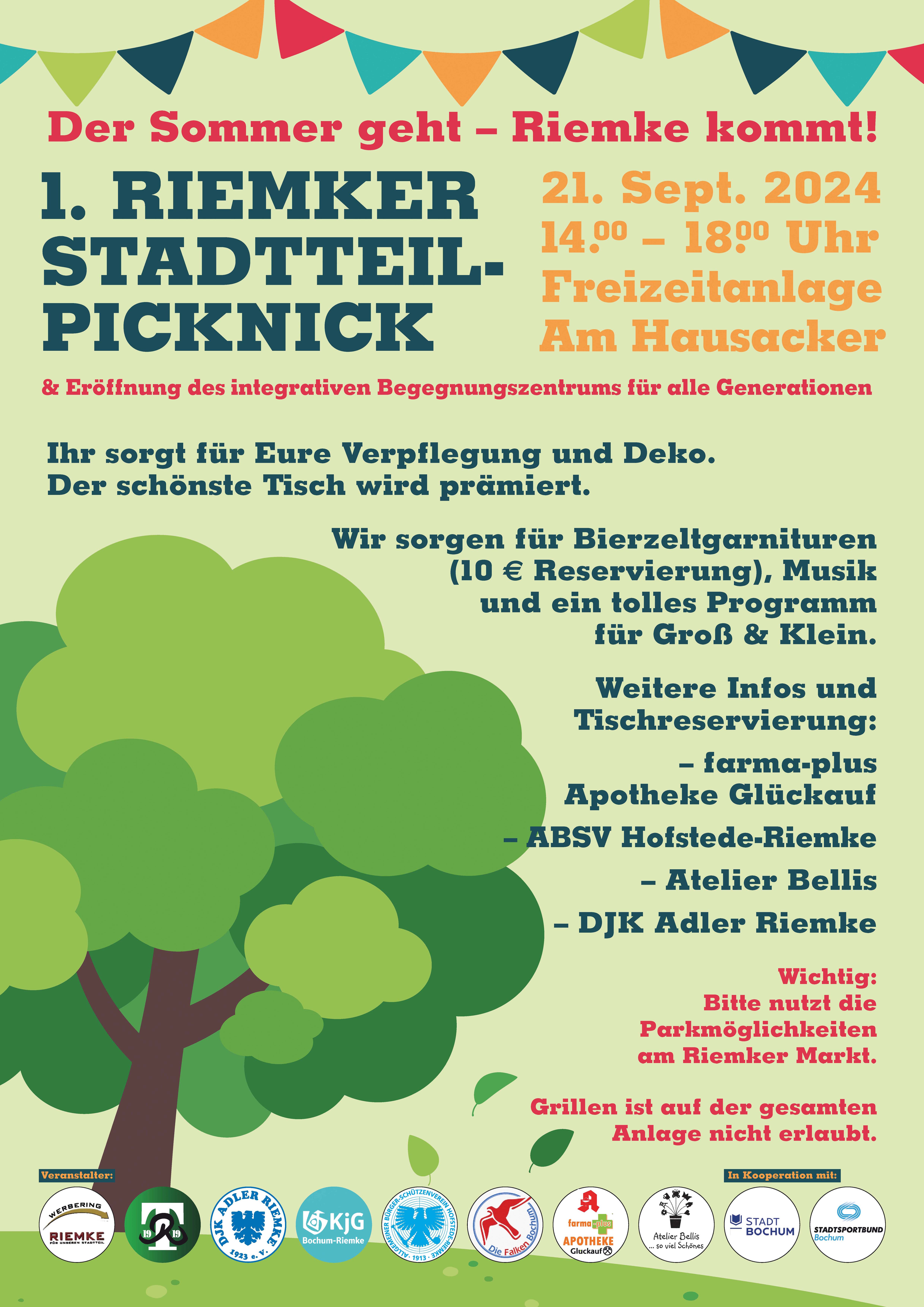 Unter dem Motto „Der Sommer geht-Riemke kommt!“ laden 8 RiemkerVereinemitunter unserem Handball-Verein Teutonia Riemke in Kooperation mit der Stadt Bochum und dem Stadtsportbund Bochumzum ersten Riemker-Stadtteilpicknick ein. Euch erwartet ein tolles, sportliches Programm mit einer Kletterwand, Hüpfburgen, Kinderdisco, einem Yoga-Schnupperkus, sowie Boule und Biathlon. Ebenfalls wird es ein kleines musikalisches und ein kulinarisches Angebot geben. Bei Bedarf können Bierzeltgarnituren reserviert werden (Infos im Flyer)oder ihr bringt euere eigenen Picknickdecken mit. Das Stadteilpicknick findet am 21.9.2024 von 14-18 Uhr rund um unser Vereinsheim und der Freizeitanlage am Hausacker (ehemals Urban Green) statt. Wir freuen uns auf zahlreiche grün-weiße Gesichter.