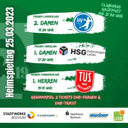 wir möchten euch herzlich zum großen Heimspieltag am kommenden Samstag in der Heinrich-Böll-Sporthalle einladen! Es erwartet euch ein spannendes Programm mit gleich drei aufeinanderfolgenden Spielen. Zuerst tritt unsere 2. Damen SV Teutonia Riemke im Kampf um die Top 3-Plätze in der Landesliga gegen Handballverein Sundern an, gefolgt von unserer 1. Damen SV Teutonia Riemke gegen 1. Frauen HSG Petershagen/Lahde , die weitere wichtige Punkte in der Abstiegsrunde der Oberliga brauchen und abschließend findet das Derby unserer 1. Herren SV Teutonia Riemke Handball gegen TuS Hattingen Handball statt.