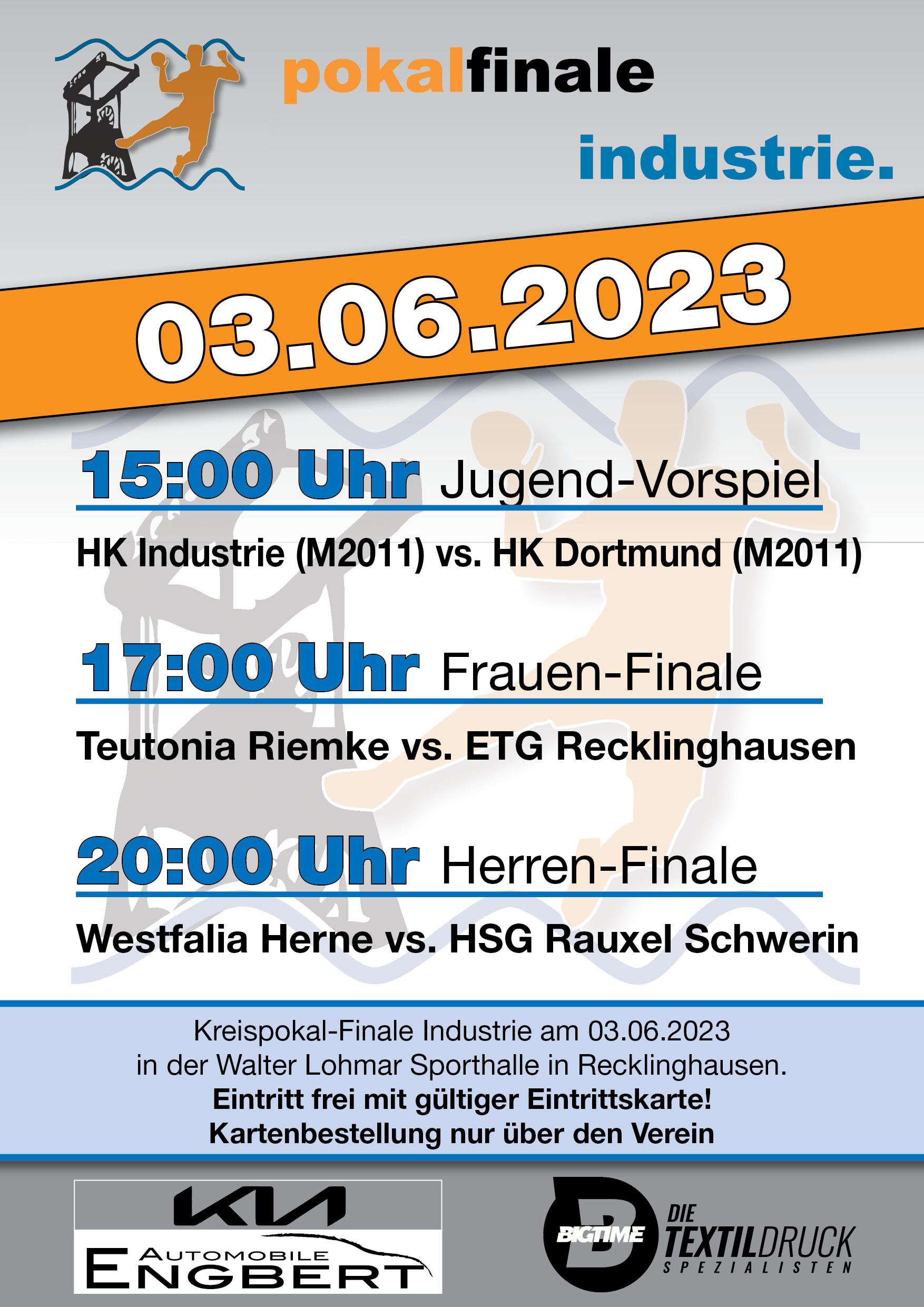 Der Tag startet um 15.00 Uhr mit einem spannenden Jugendvorspiel. Die Kreisauswahlmannschaften der Kreise Industrie und Dortmund treffen in einem Kurzspiel mit zweimal 20 Minuten aufeinander. Um 16.00 Uhr machen sie Platz für die Damen-Finalisten, die dann 45 Minuten Zeit haben, um sich aufzuwärmen. Spätestens um 16.45 Uhr müssen sie die Spielfläche verlassen, denn um 16.50 Uhr erfolgt die Ankündigung der Mannschaften und Schiedsrichter mit einer Fanfare und dem bekannten Steiger Lied aus dem Ruhrgebiet als Einlaufmusik. Die "Eisenbahner Zauberbande", eine integrative Handballmannschaft der ETG, begleitet das Einlaufen. Nach der Vorstellung der Akteure beginnt das Spiel pünktlich um 17.00 Uhr.